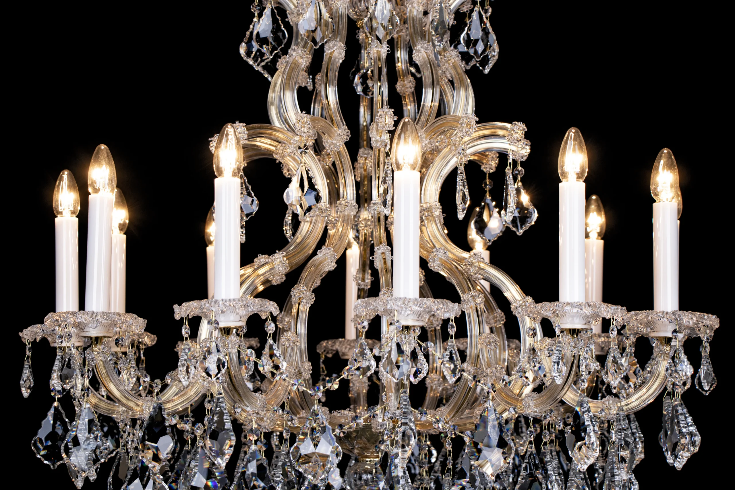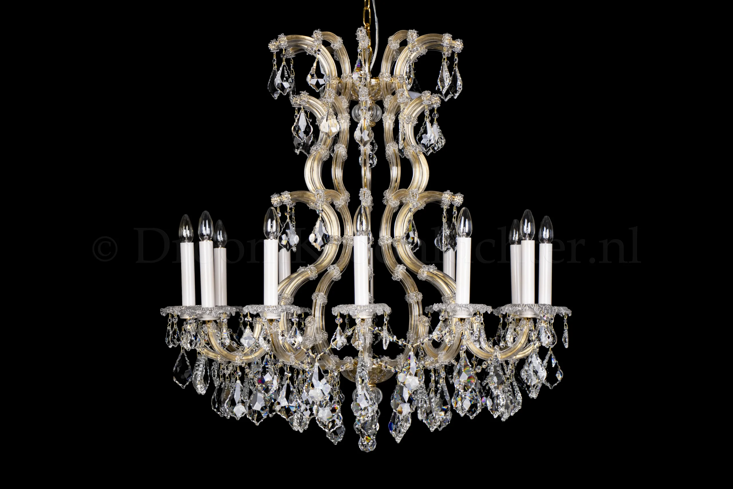 Een sierlijke kristallen kroonluchter met 12 lichtpunten. De Louis Baroque 12 lichts kroonluchter is uitgevoerd in goud en heeft een hoogwaardige afwerking. De pegels zijn van hoogwaardig kristal, het armatuur is een combinatie van metaal en glas. De kaarshulzen zijn maar liefst 15cm hoog en van wit glas. De pegels aan deze kroonluchter zijn extra groot voor een schitterend effect.